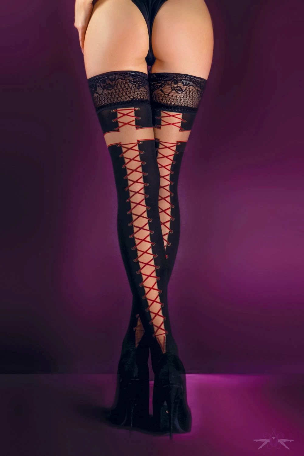 A striking pair of black hold ups from Ballerina. These hold ups have a black leg with stunning detail on the back. The lace up detail looks lovely and creates a seam effect with faux stitching in mulberry.