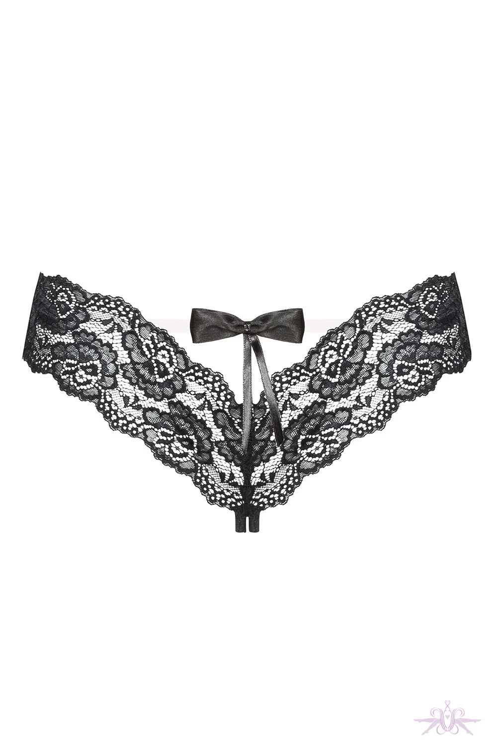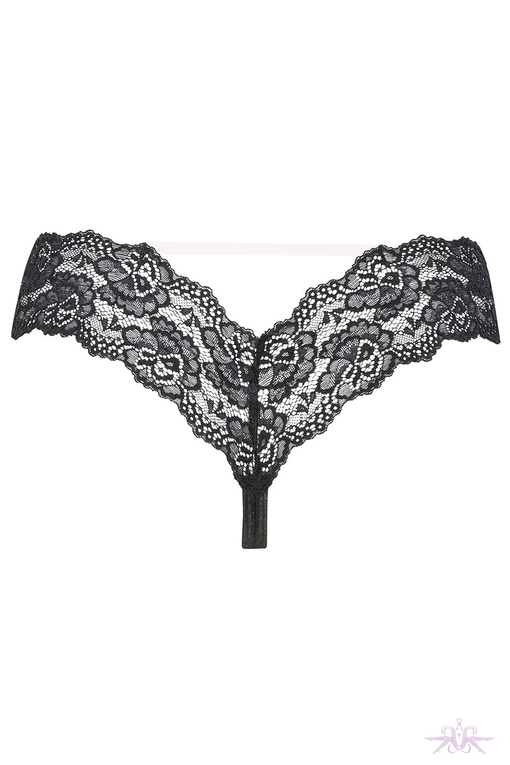 Selina is a very seductive lace thong. The lace at front and at the back is connected by a transparent silicone strip allowing for a gorgeous shape as it sits on the hips. This front strip is decorated by a satin bow.