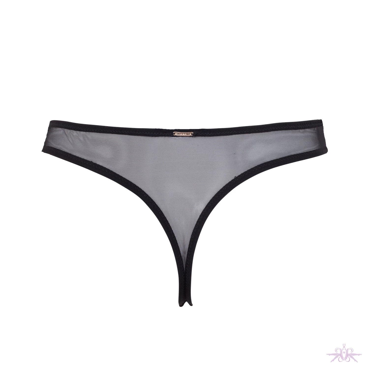 Stunning Addison thong from Bluebella. Superfine mesh and lace combine to create a strong contrast of textures in this piece. Directional strapping is used to create a false high-waisted effect, flattering the figure and sculpting the waist. Hints of metallic thread flash and shimmer in the black lace panel, and the superfine mesh is soft against the skin. An Art deco style hard-wear centrepiece completes the look. Matching Bralette and Brief available.