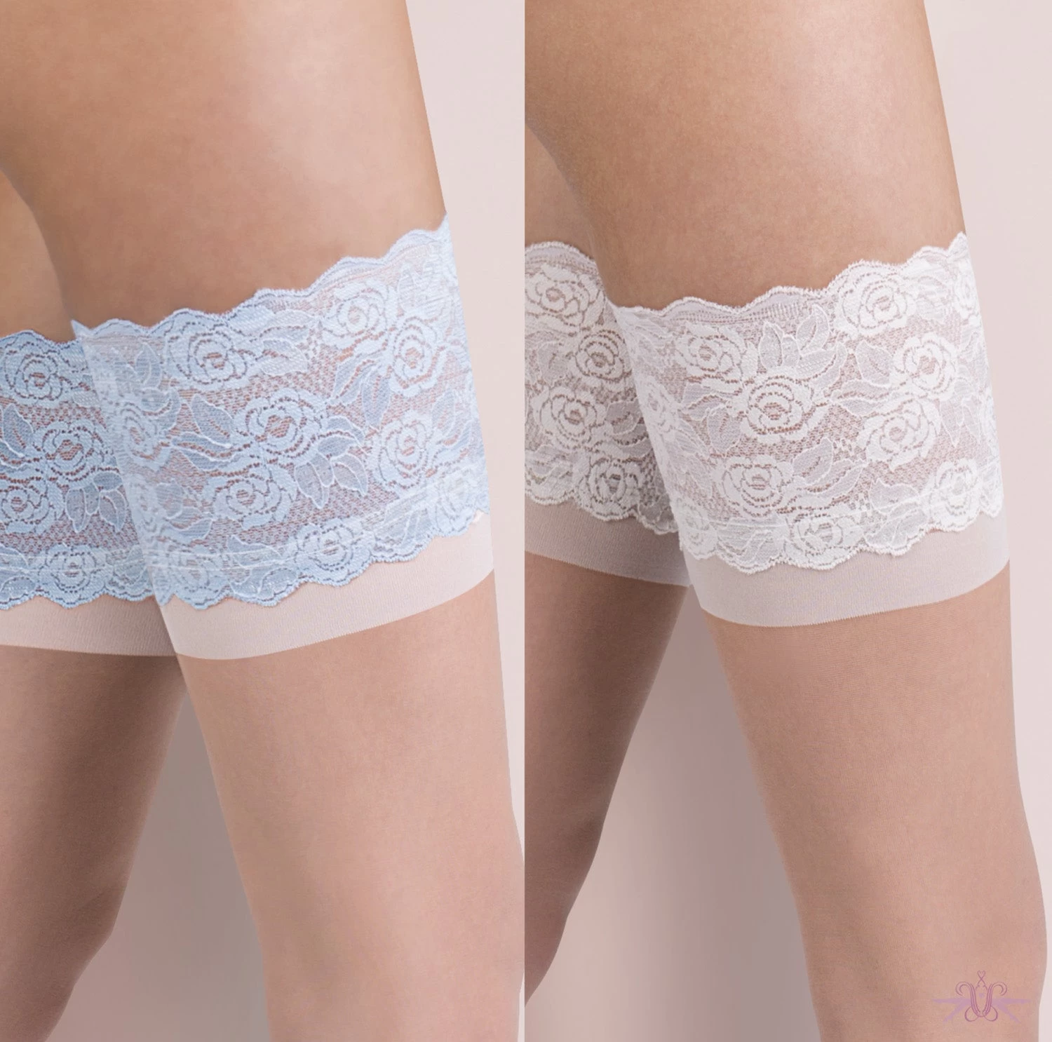 Introducing the elegant Isabelle, from the new Gabriella collection ‘In Love’. A feminine design embracing decorative sexy lace with a subtle pattern. The legs are sheer nude with a deep lace top band in champagne edged with blue or plain champagne. Which will give the effect of a garter.