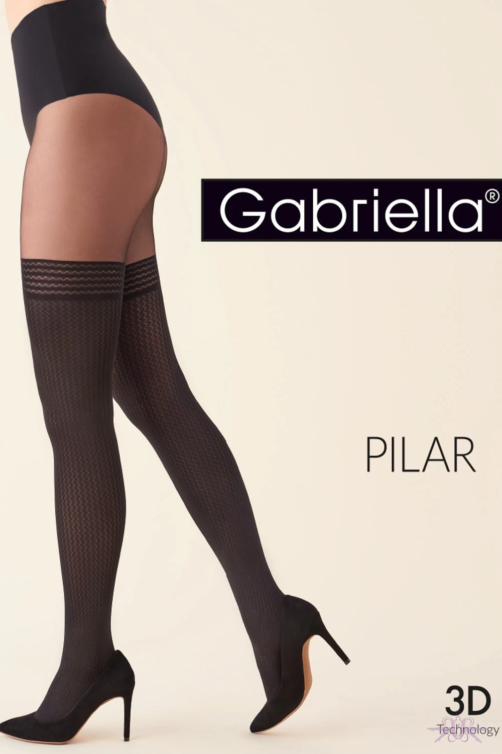A gorgeous microfibre opaque mock hold up tight from Gabriella. The leg is opaque with a vertical zig zag line and horizontal faux stay up band. The thigh to the waist is sheer.