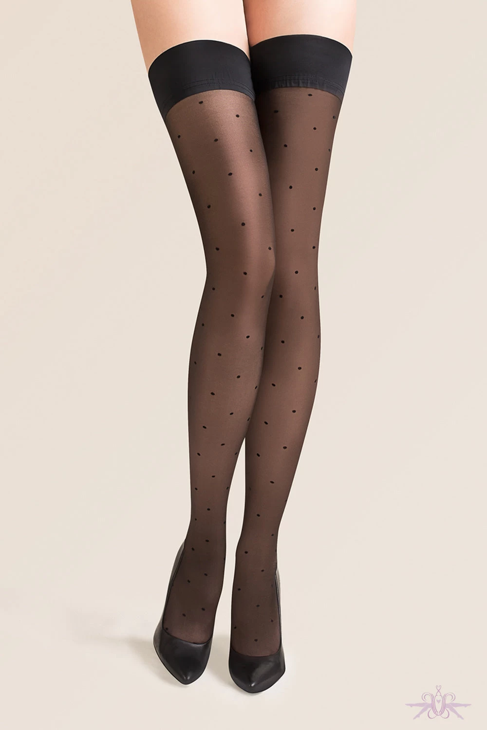 A glamorous pair of sheer hold ups from Gabriella. They have a microdot pattern and a plain band with a double silicone strip, to hold them in place all day long. They are great for day wear or something different on that evening out.