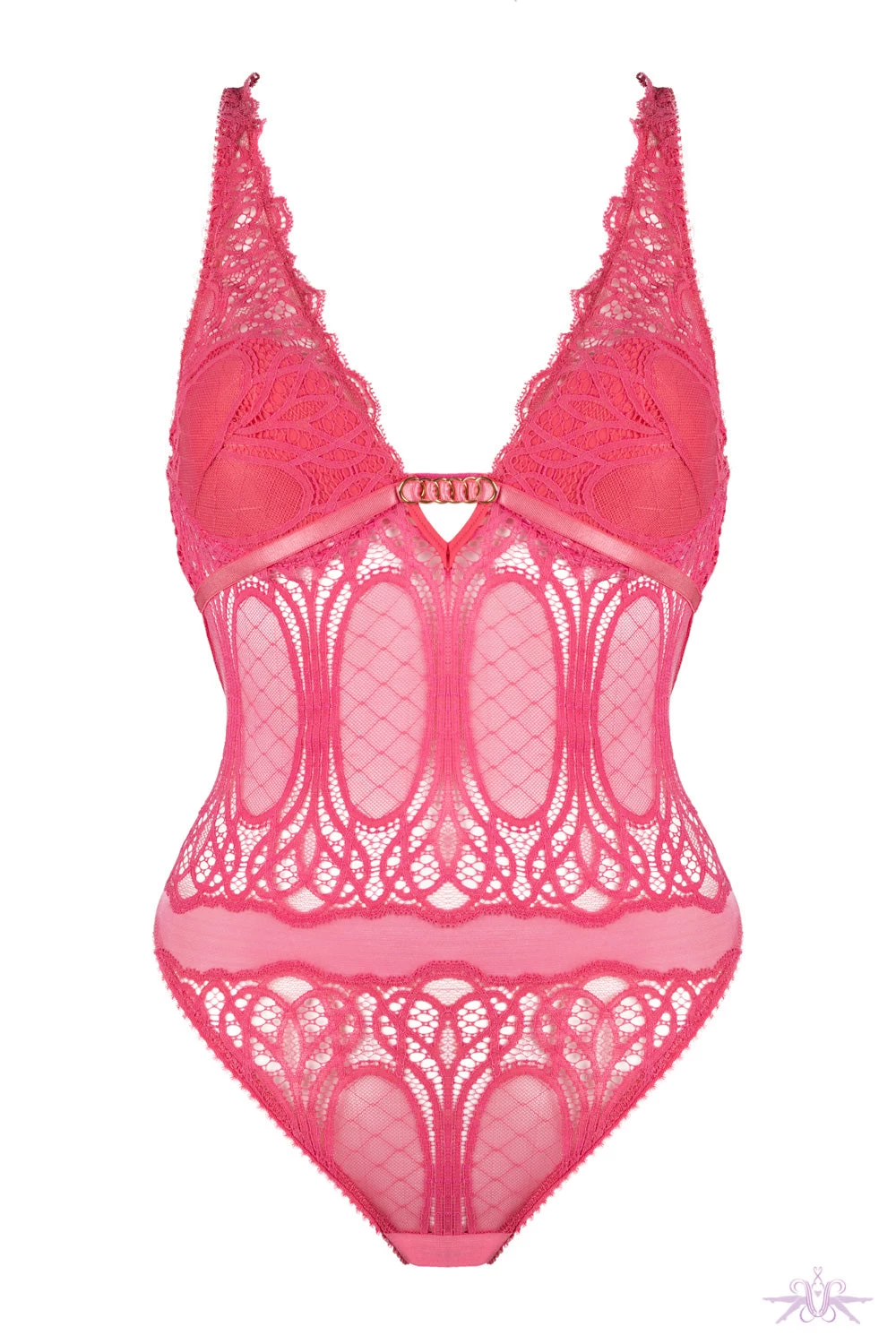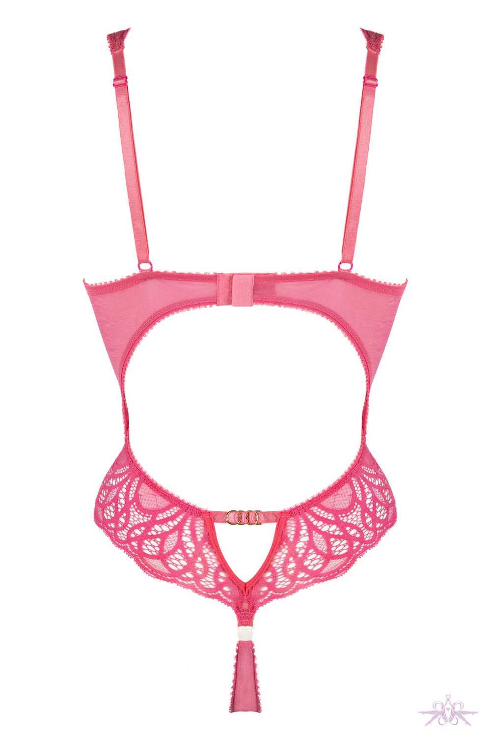 A beautifully seductive lace bodysuit from the Angels collection at Jolidon. This bodysuit will enhance the feminine curves with its sheer floral lace panels and underwired bust. The cups are slightly padded and an elastic strap adorned with gold circles sits underneath. The open back is very sensual and the thong is openable by a clip fastening.