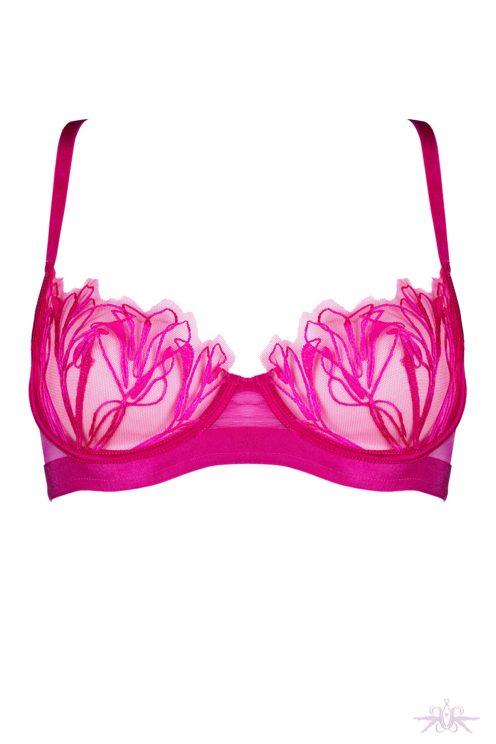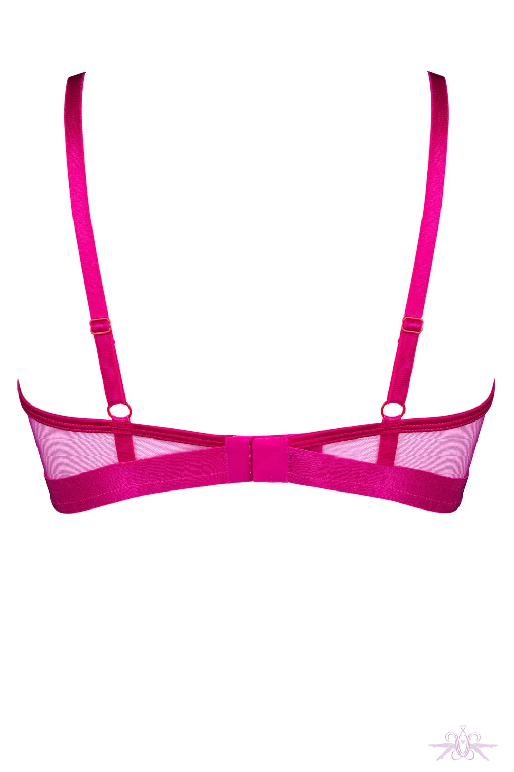 A seductive underwired sheer mesh fuchsia pink bra from the supreme collection at Jolidon. This pink lace bra has sheer floral mesh lace with delicate scalloped edging. Deep elastic strapping outlines the bust and adjustable straps and hook and eye fastening to the rear making for a perfect fit. Matching items are also available.