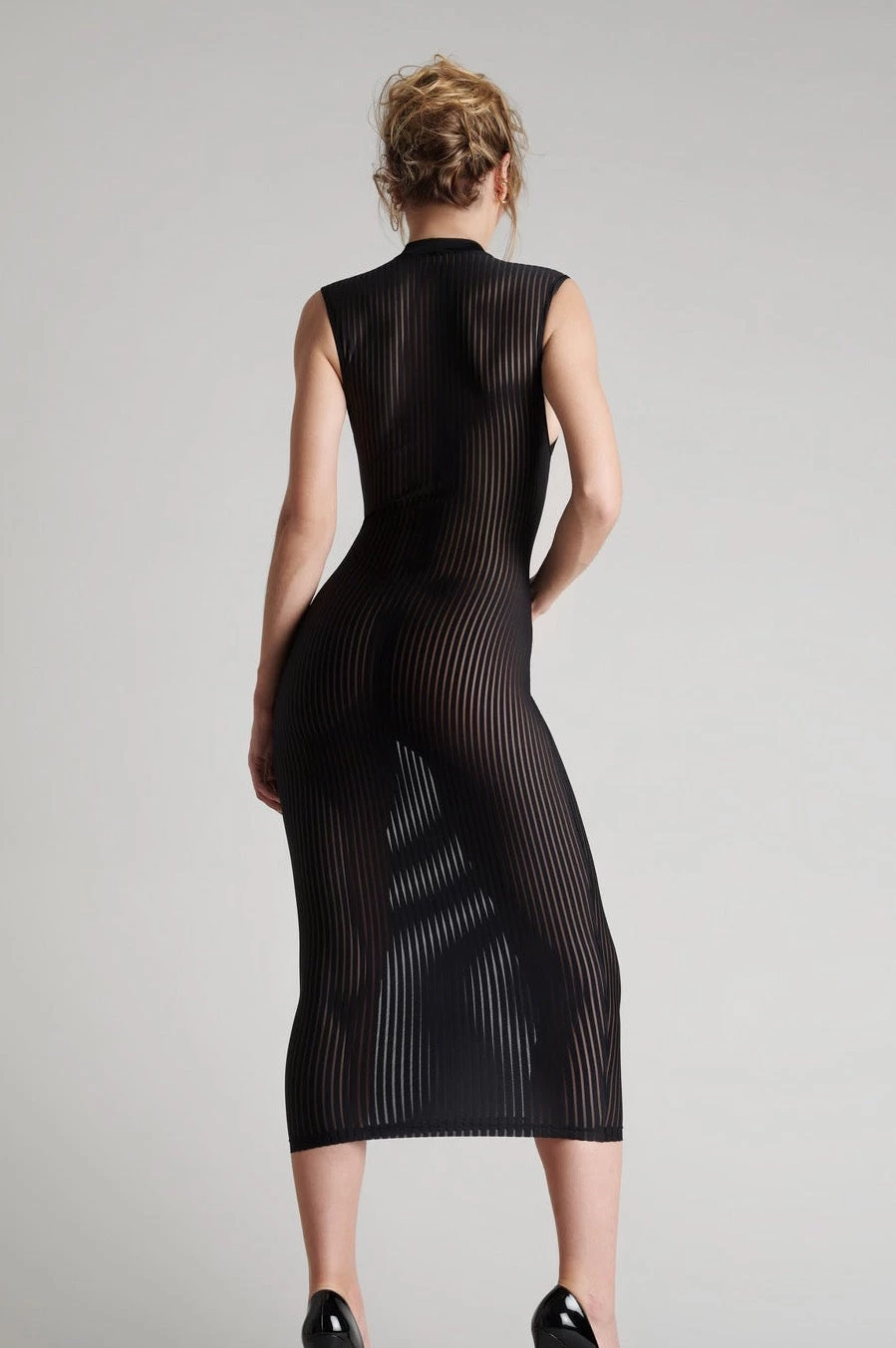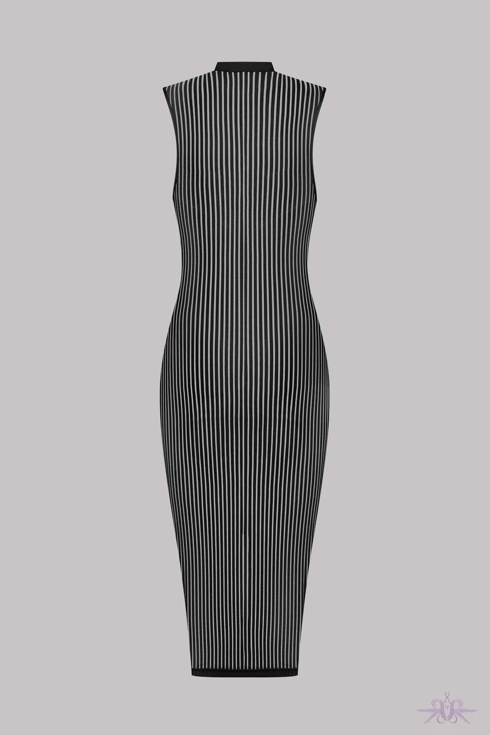 This gorgeous sleeveless dress a new edition to the Bande à Part collection at Maison Close. This piece is designed with graphic lines which slim and lengthen the body and is semi-sheer in appearance with soft tulle and microfibre fabric. The high neck on this sleeveless dress and the semi sheer fabric make this a captivating piece, with a figure flattering cut that encapsulates the feminine form to the greatest effect. Matching items also available.