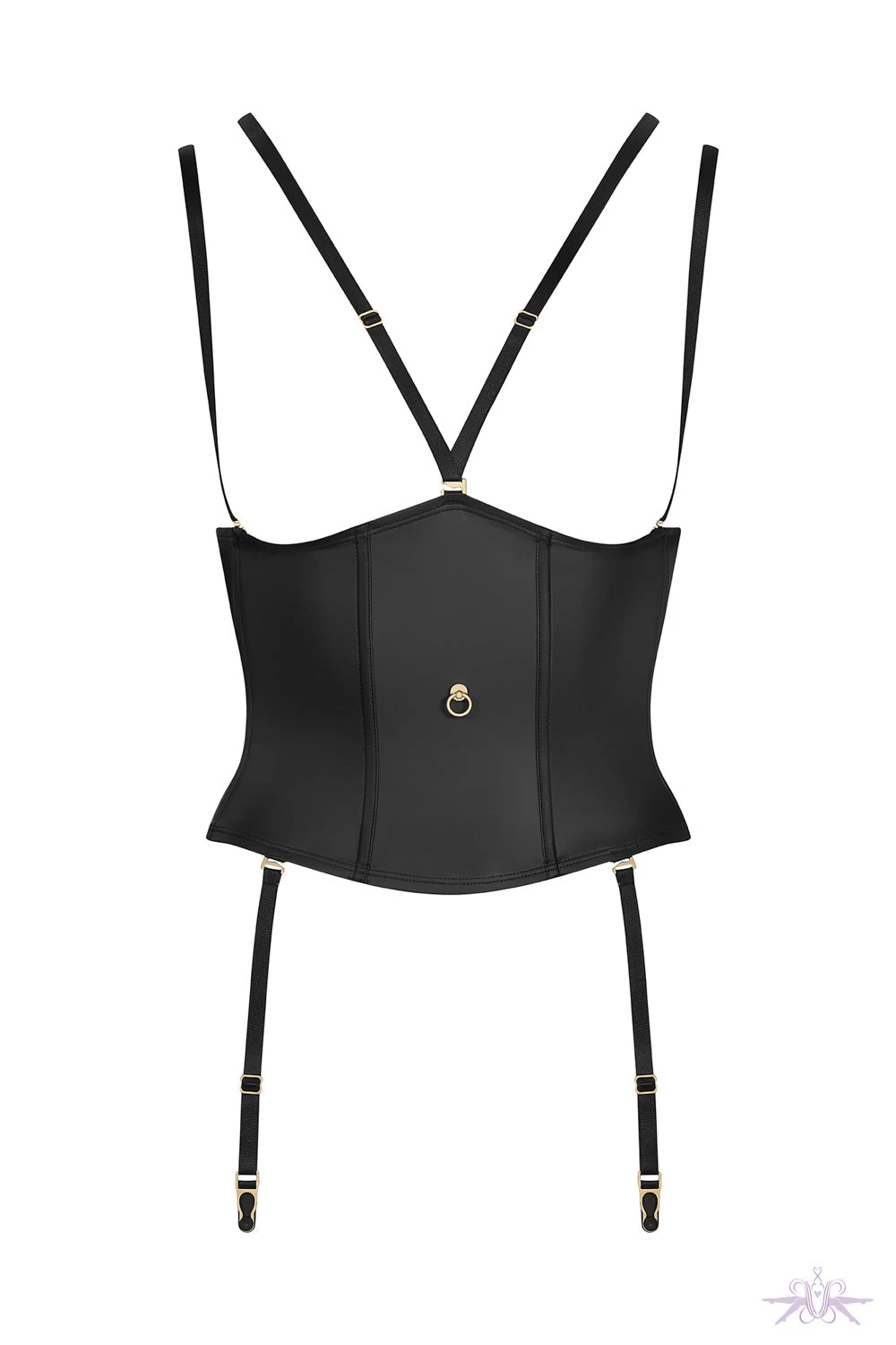 A beautiful matte leather look waist cincher from Maison Close. Really show off your curves in this stunning shape wear that enhances the waist. Suspenders, straps and choker harness are removable and can be adjusted with golden ornamental trims. The flexible vertical whalebones improve structure and support. Adjustable hook-and-eye fastening on the back. Matching items are also available.