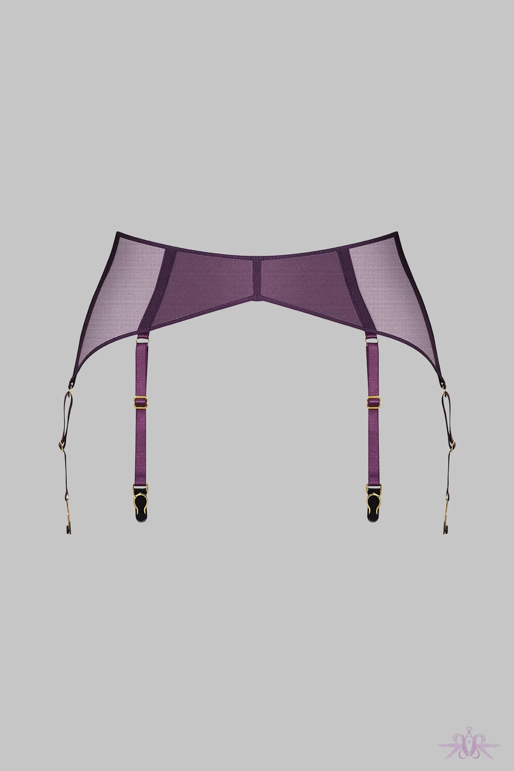 A beautiful sheer suspender belt in violet from Maison Close. It has an arched front with lined mesh for a contrast of transparency and opacity. There are six adjustable, non-removable garters which outline the thighs. Sleek and subtle hook and loop back closure.