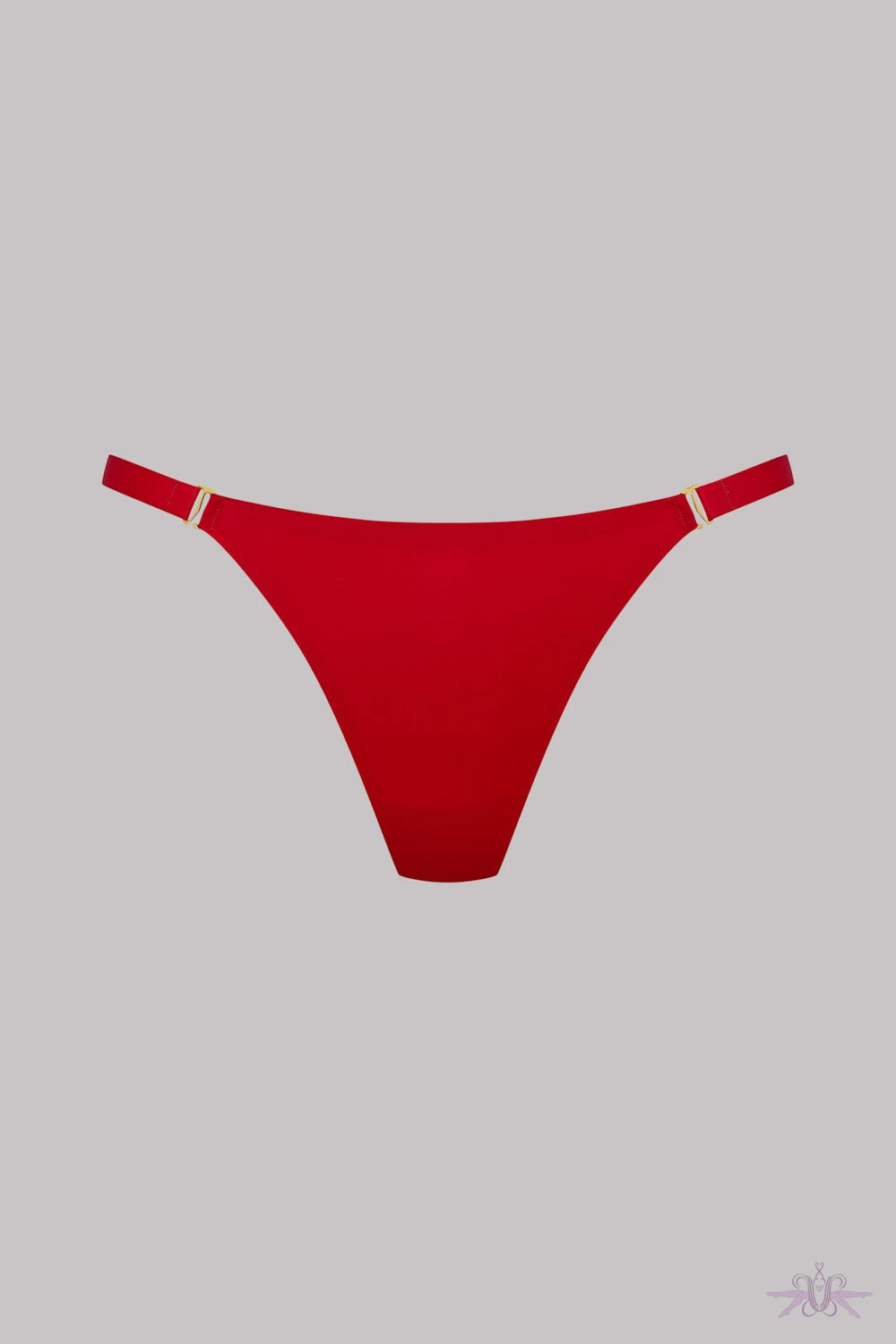 A seductive mini thong from the Tapage Nocturne collection at Maison Close. This super soft microfibre thong is so alluring with its gold tone hardware. The waistband is adjustable to ensure a perfect fit and also opens to the front. Pair with the matching cupless triangle bra.