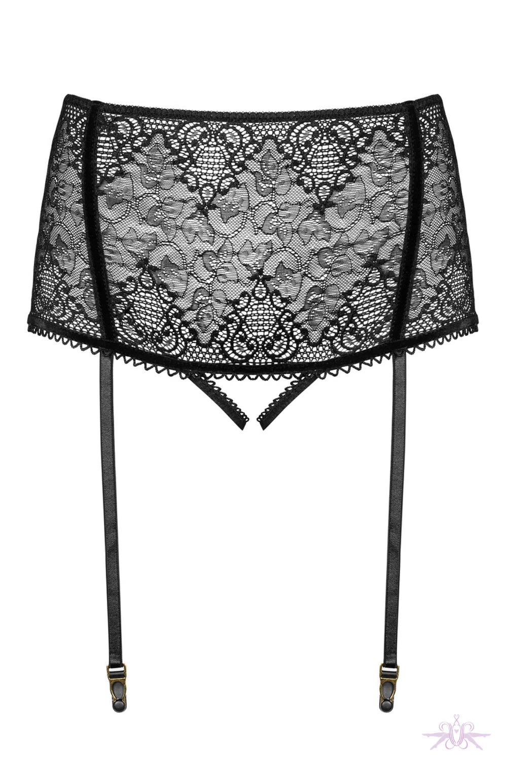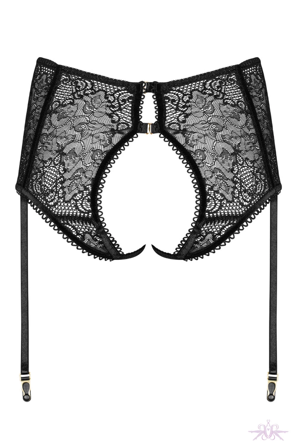 An extremely seductive open crotch suspender panty from MissO. The sensual lace and velvet detailing are so sensual whilst the elasticated straps delicately caress the buttocks for a perfect fit. The four suspender straps are adjustable with gold clips. This is a gorgeous piece of lingerie will surely excite the senses.