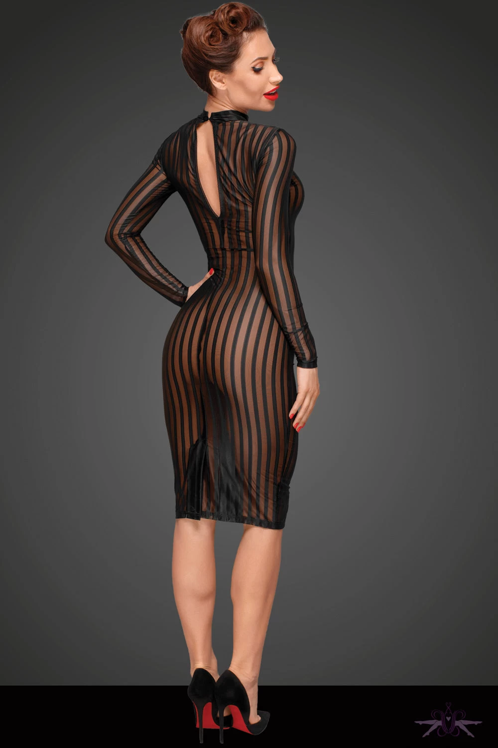 A seductively sheer classic dress from Noir Handmade. This beautiful soft tulle dress is incredibly comfortable to wear due to its multi-stretch fabric. The sheer fabric is interspersed with black pin-stripes. A lovely high collar creates a feminine finish and is fastened with a button.