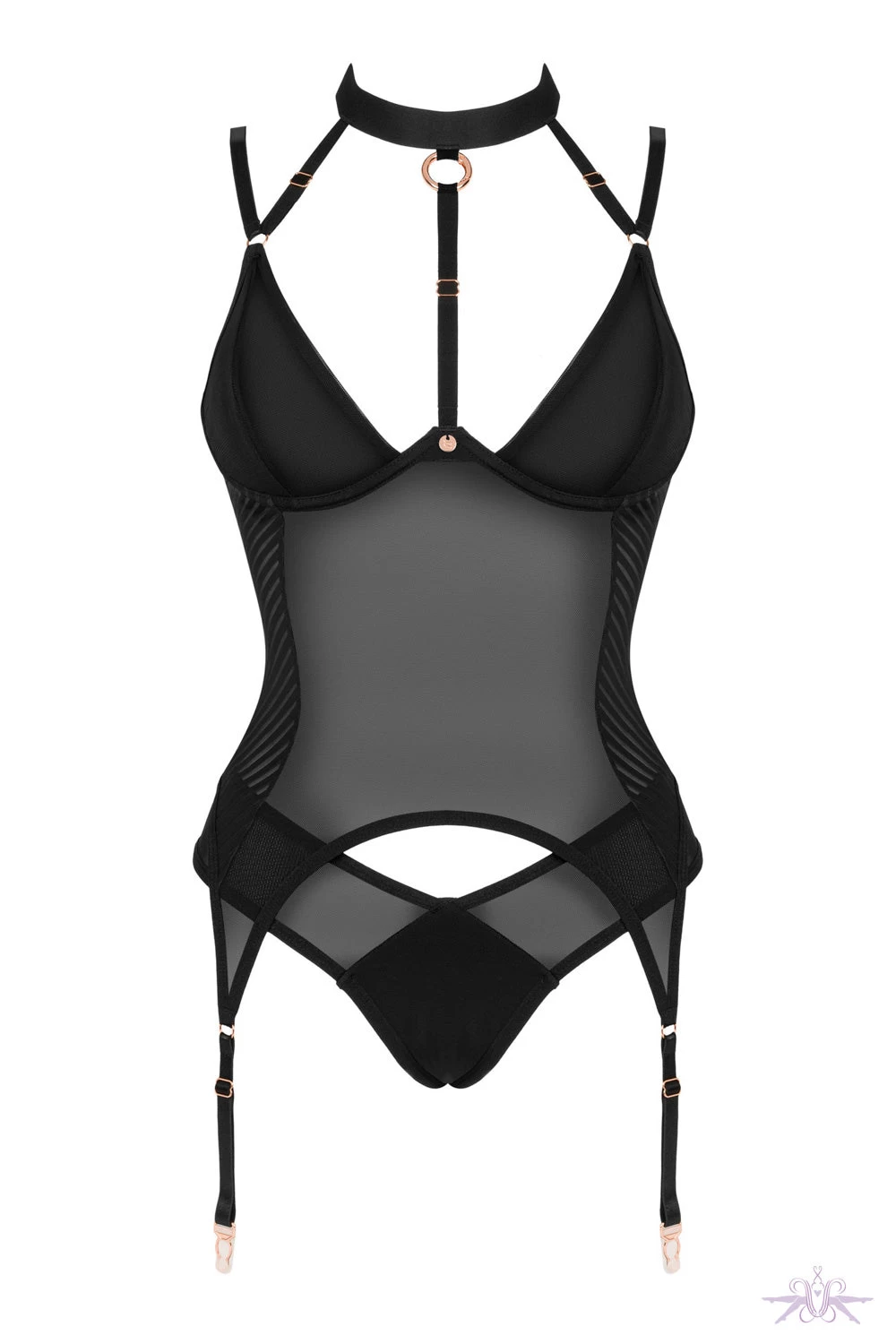 The black Brasica corset is a minimalist cut combined with beautiful details in a shade of rose gold. This is an exceptionally elegant design, made of delicate mesh. The sides of the corset decorated with stripes will beautifully accentuate your waist. Hook-and-eye fasteners, matching panties and a jewellery ring on the neck.