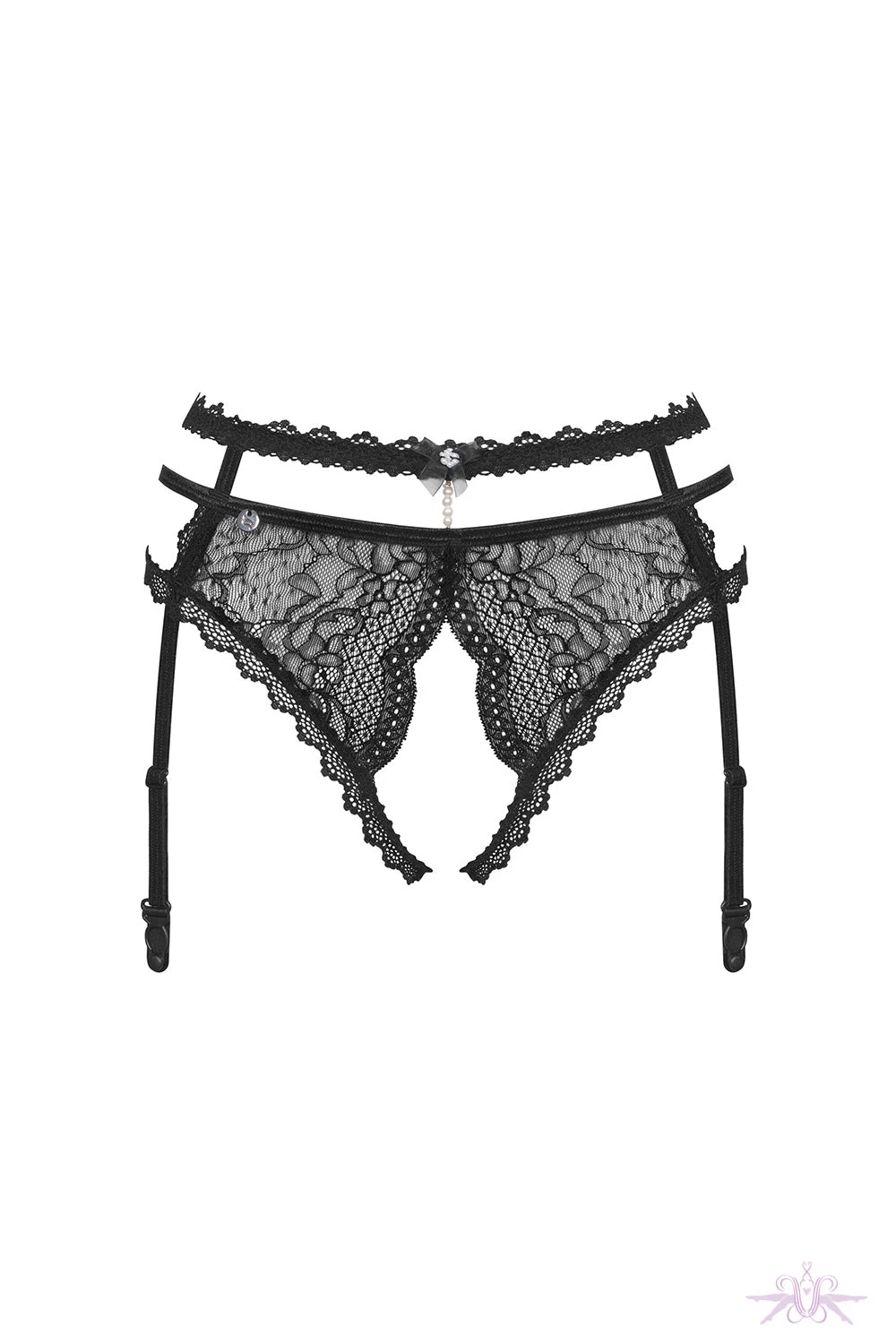 A seductive suspender belt and pants set in one from Obsessive. The gorgeous combination of pearls and lace is intriguing along with the elastic straps which wrap around the body emphasizing the hips and the cut-out at the back which accentuates the derriere. The open crotch makes this an alluring piece of lingerie for the boudoir.
