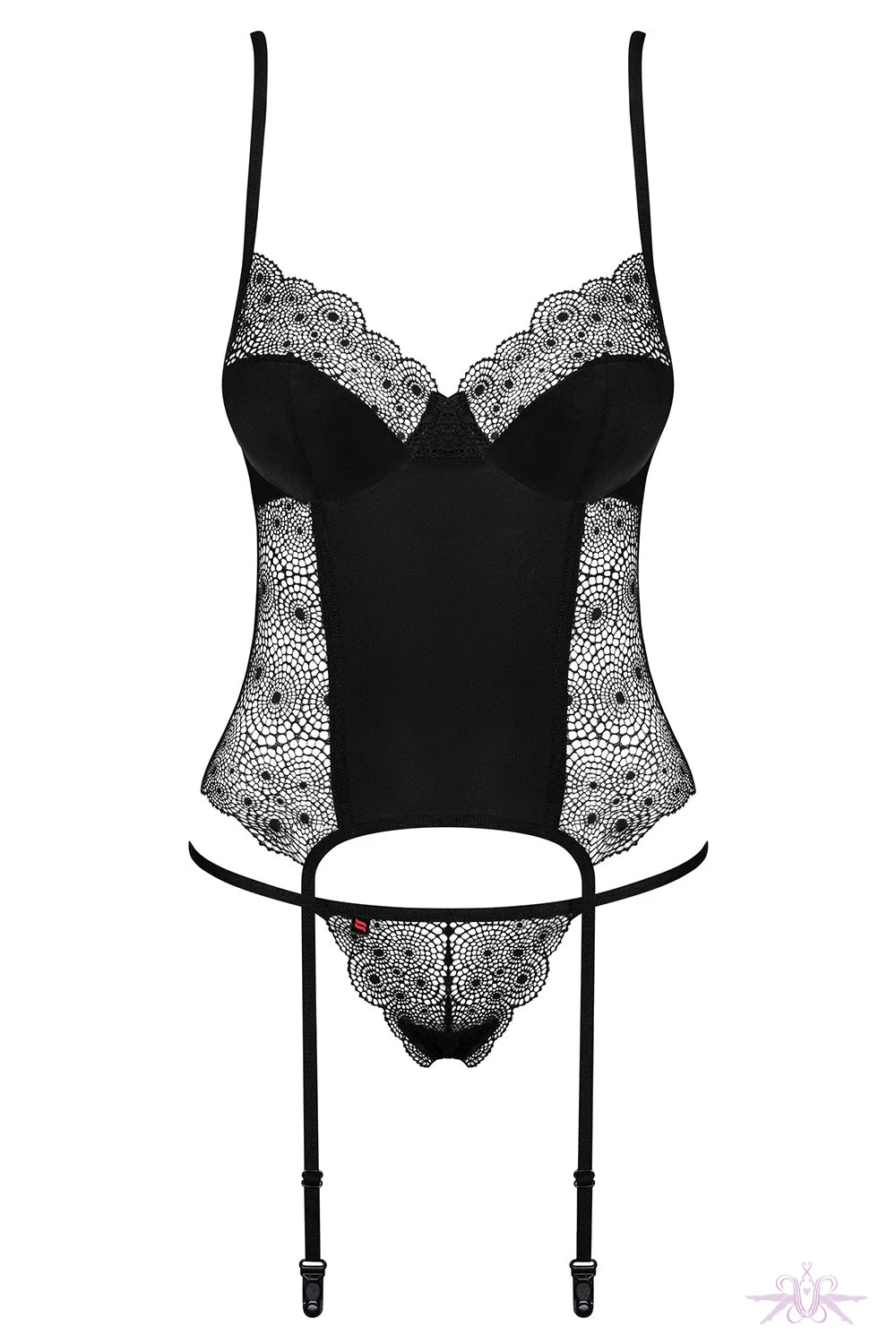An extremely feminine and eye-catching corset to make you feel special. The black lace detail is sumptuous and feels divine. The non padded cups are underwired and enhance the bust. The panelling at the front elongates the body whilst the lacing on the back of the corset helps to create the perfect shape. There are four adjustable suspender straps to hold your stockings securely in place. Matching thong is also included.