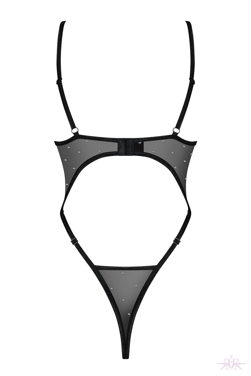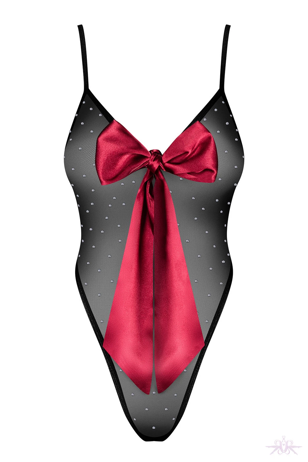 A gorgeous black sheer mesh bodysuit with tempting polka dot design. It has a lovely soft red satin bow at the front and adjustable fitting on the shoulder straps and a bra fastening to the rear. Featuring a daring open back and side adjusters to the thong briefs for the perfect fit. The low plunge neckline adds a glamorous edge is also openable.