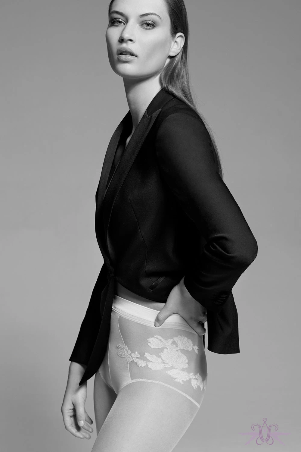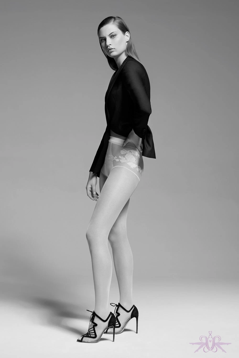 A sumptuous pair of sheer tights with a beautiful classy panty section which is embellished with floral decorations. These 20 denier tights are perfect for all year round. Available in black, nude or (plombe) pewter.