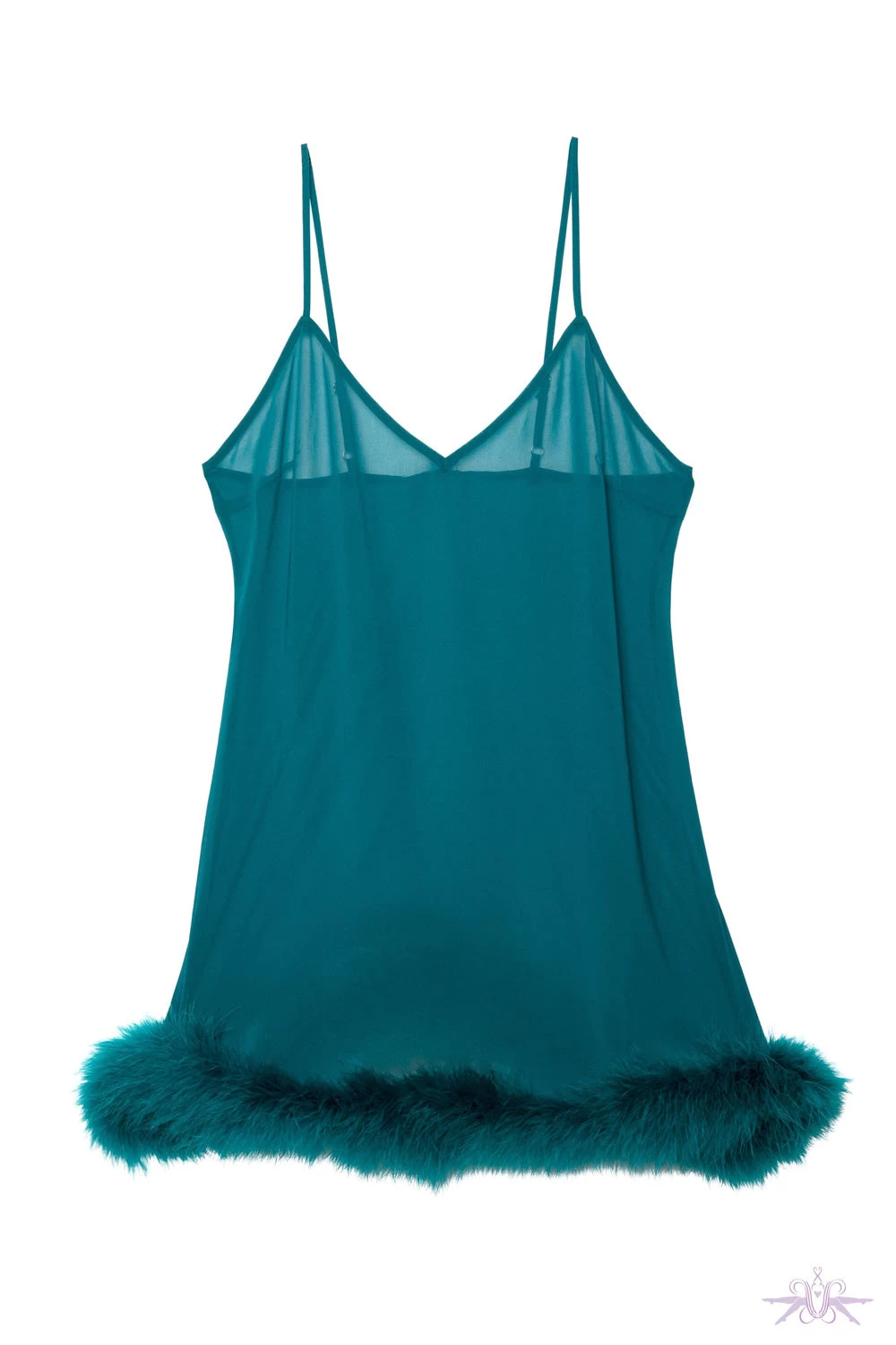 A gorgeous teal babydoll that has glamour and sophistication with its sheer fabric and luxurious faux feather trim. Complete the look with the matching Teal Feather Robe.