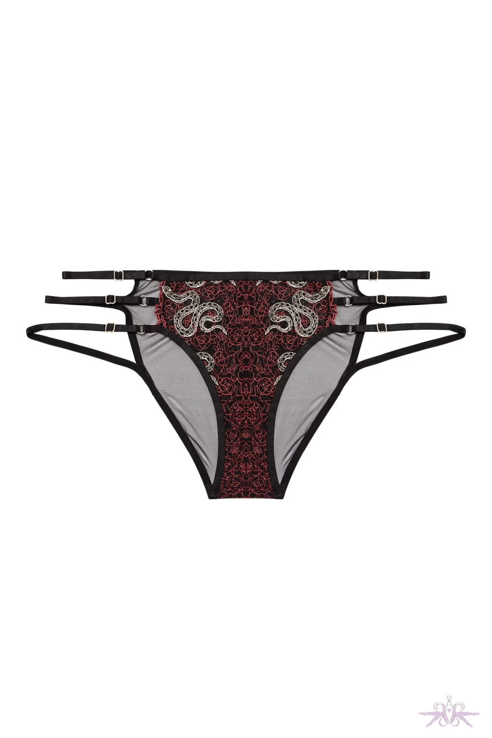 A bold brief from the autumn collection at Playful Promises. This gorgeous little brief is in autumnal colours with snake embroidery over black mesh and glistening gold and red embroidered florals. There are three elastic straps to each side that are adjustable. Matching basque is also available.