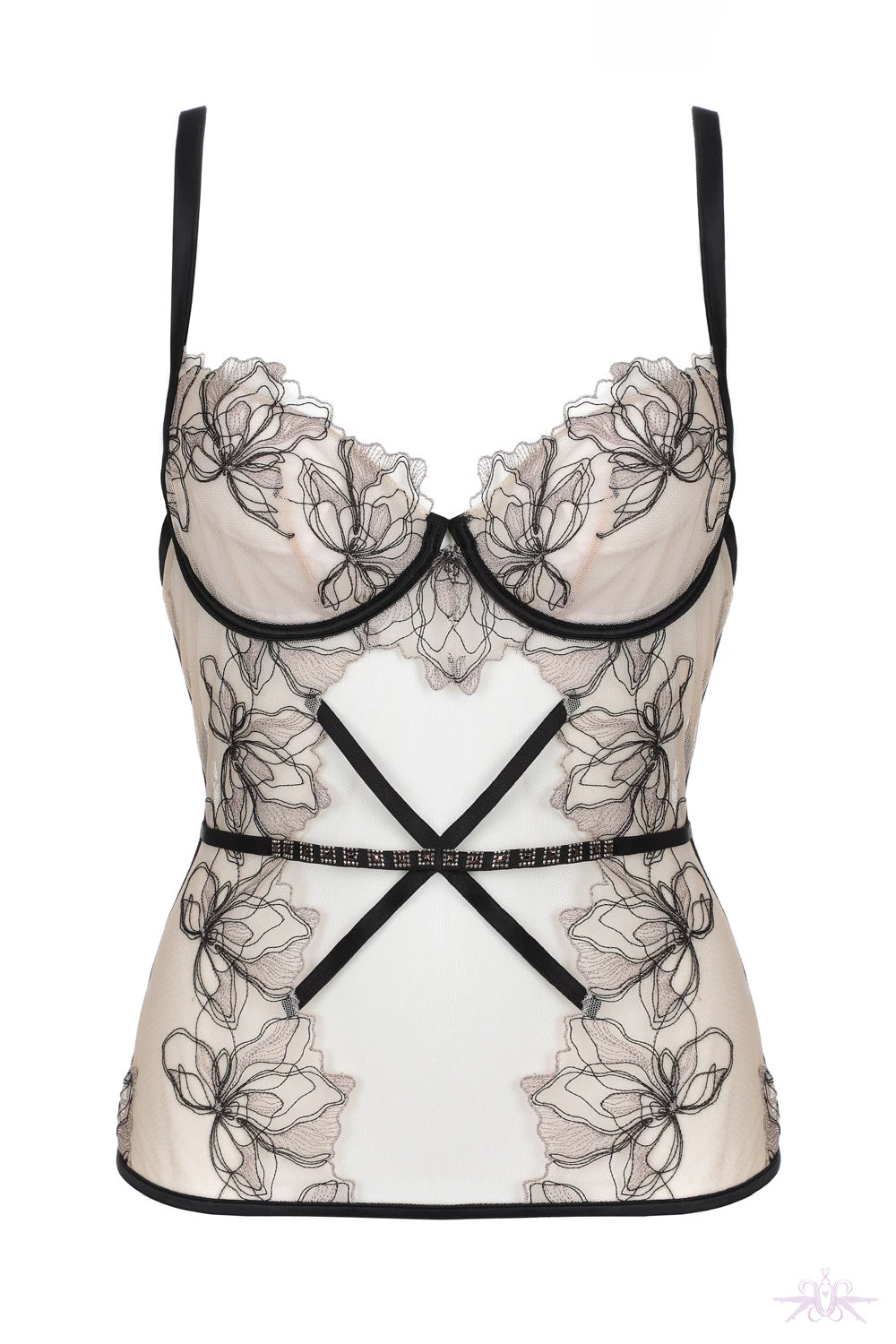 A decadent underwired bodice from the Prelude collection at Jolidon. It is made from nude sheer mesh tulle overlaid with floral mesh lace detail and delicate scalloped edging. The mesh is entwined with black and gold lurex thread which adds sparkle whilst on the front there is a criss cross black elastic adorned with embellishments.