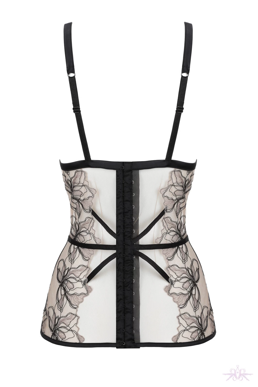 The rear follows the same design as the front along with corset style hook and eye fastening running the length of the bodice. The whole garment is edged in gorgeous black satin. Matching items including the thong are also available in the collection.