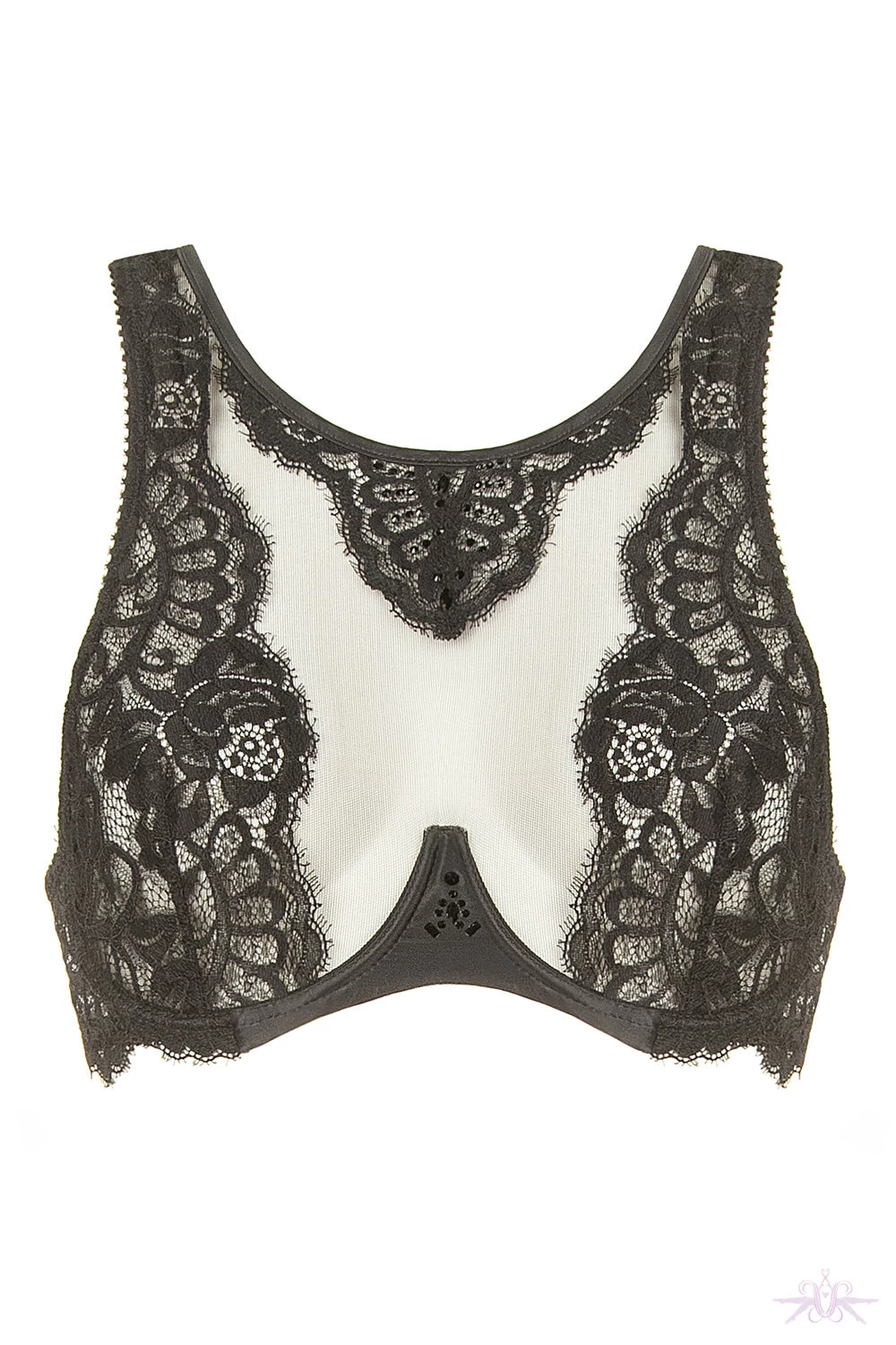 An alluring bra in lace and tulle from the Marlene collection at Prelude Milano. This satin edge underwired bra is truly stunning with the sheer section covering yet enhancing the bust. The triangular section of lace that surrounds the breasts adds a gorgeous feminine accent and the black Swarovski crystals in the centre add sparkle. The back of the bra has two vertical lace straps which are connected at the top. The bra is fastened by way of a hook and eye.
