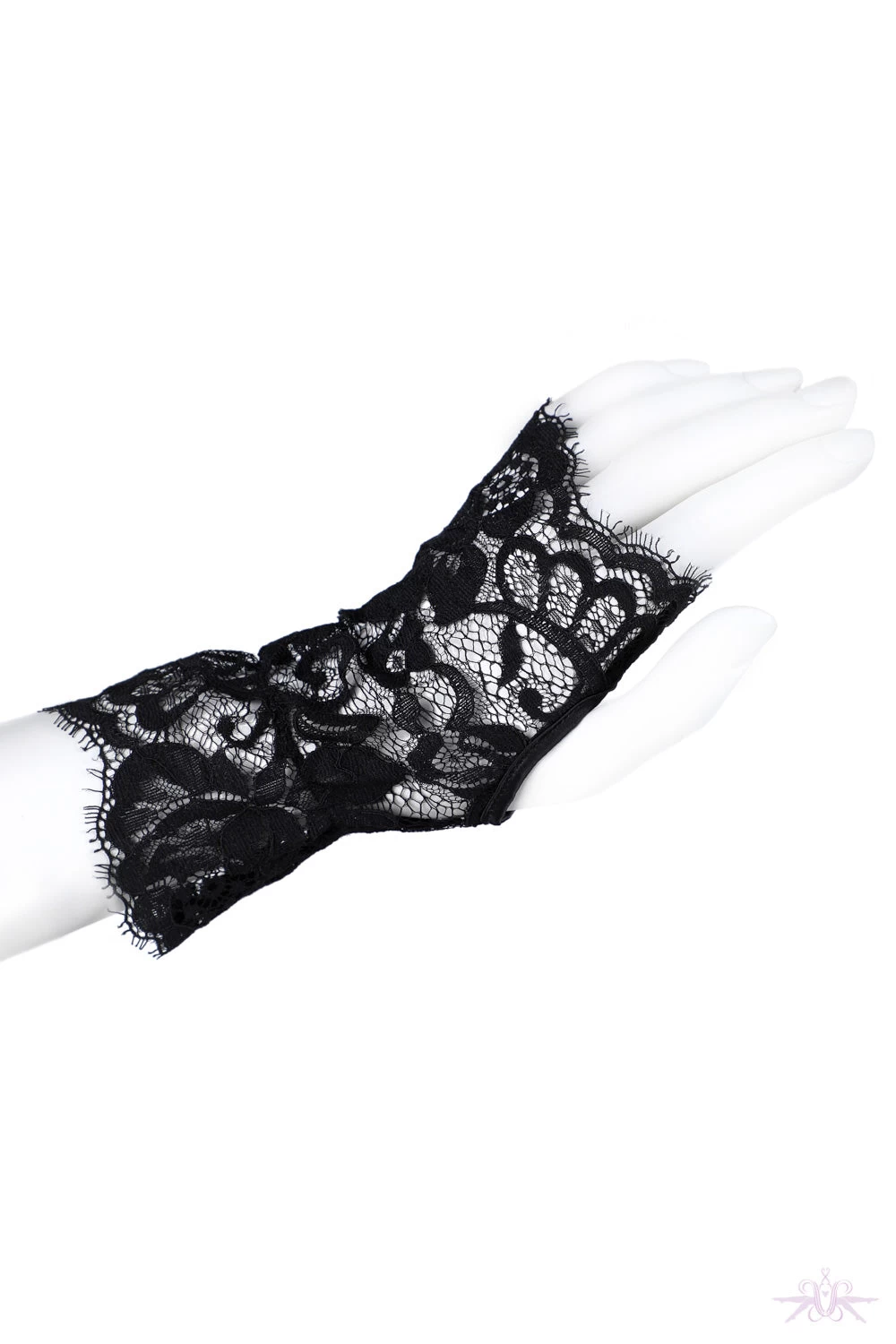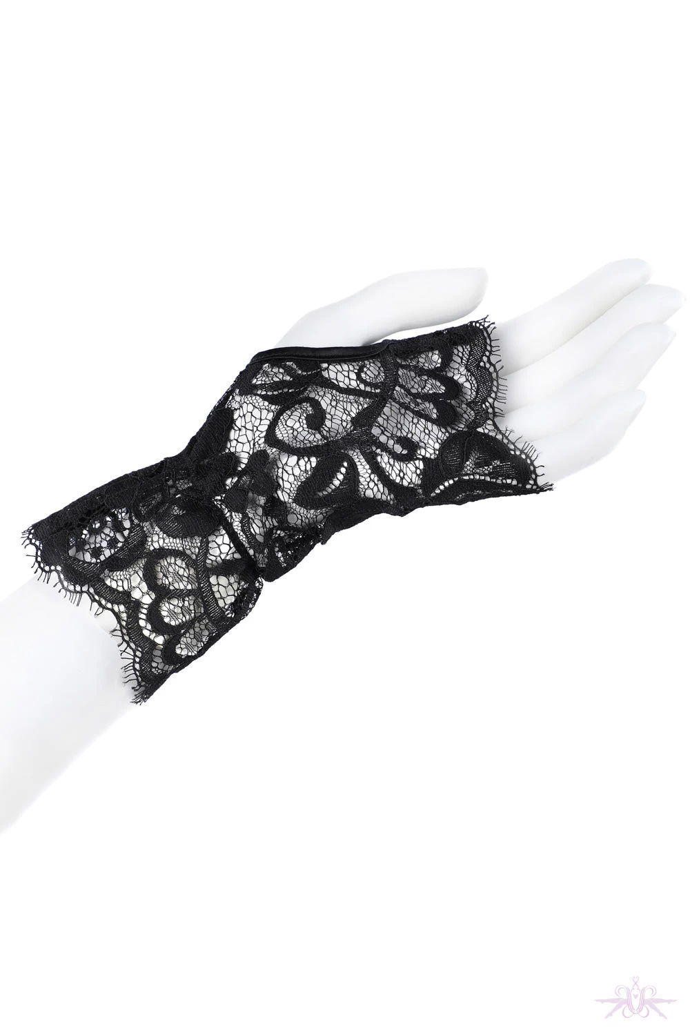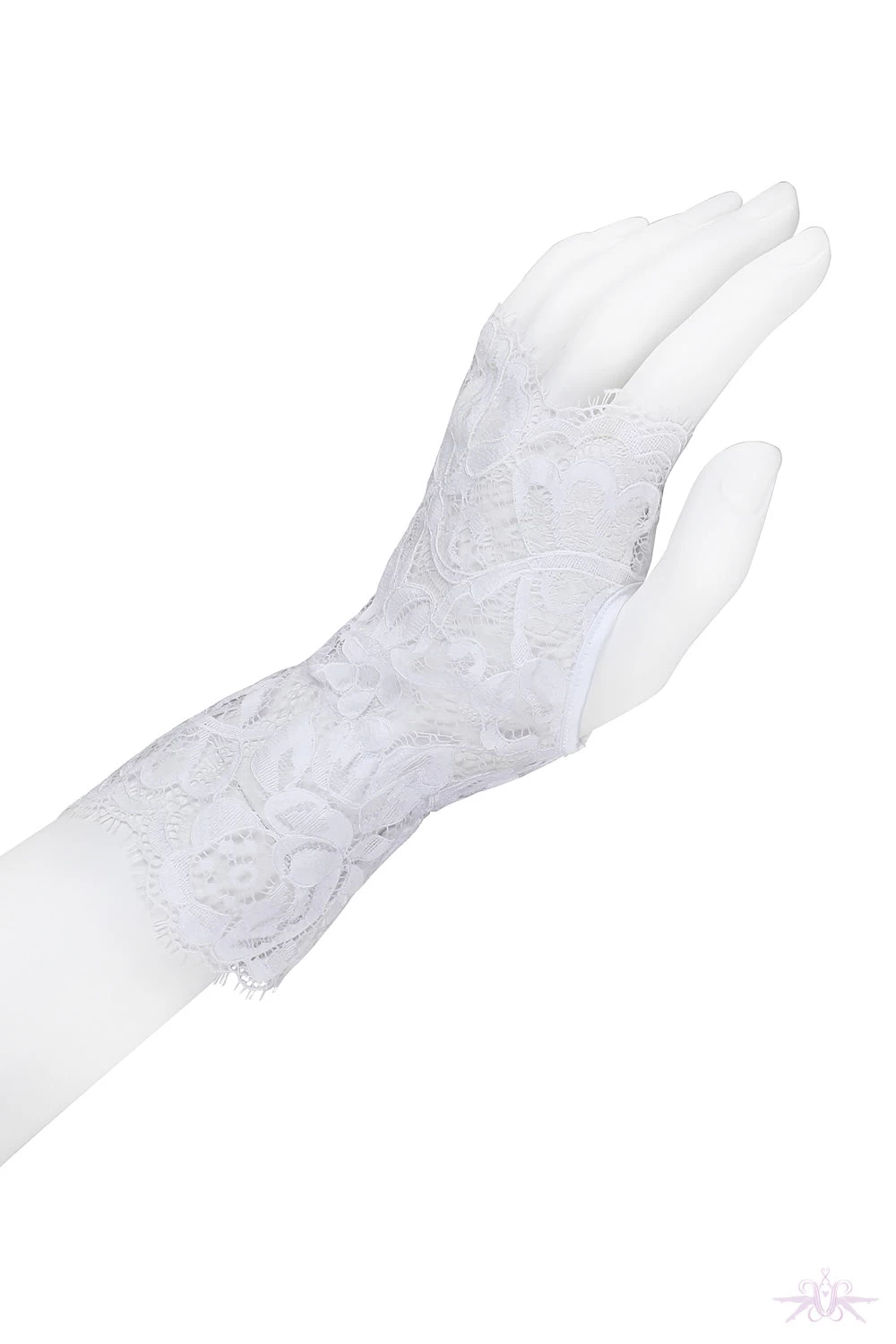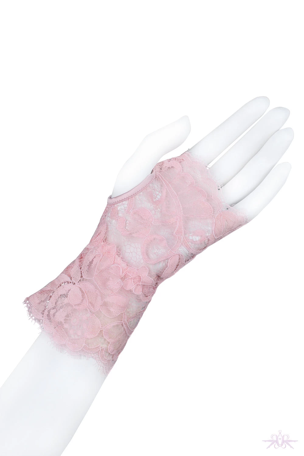 These luxurious delicate fingerless lace gloves are from Prelude Milano, part of their Marlene lingerie collection. Featuring a decorative satin piped opening for the thumb for a comfortable fit. Available in pink, white and black.