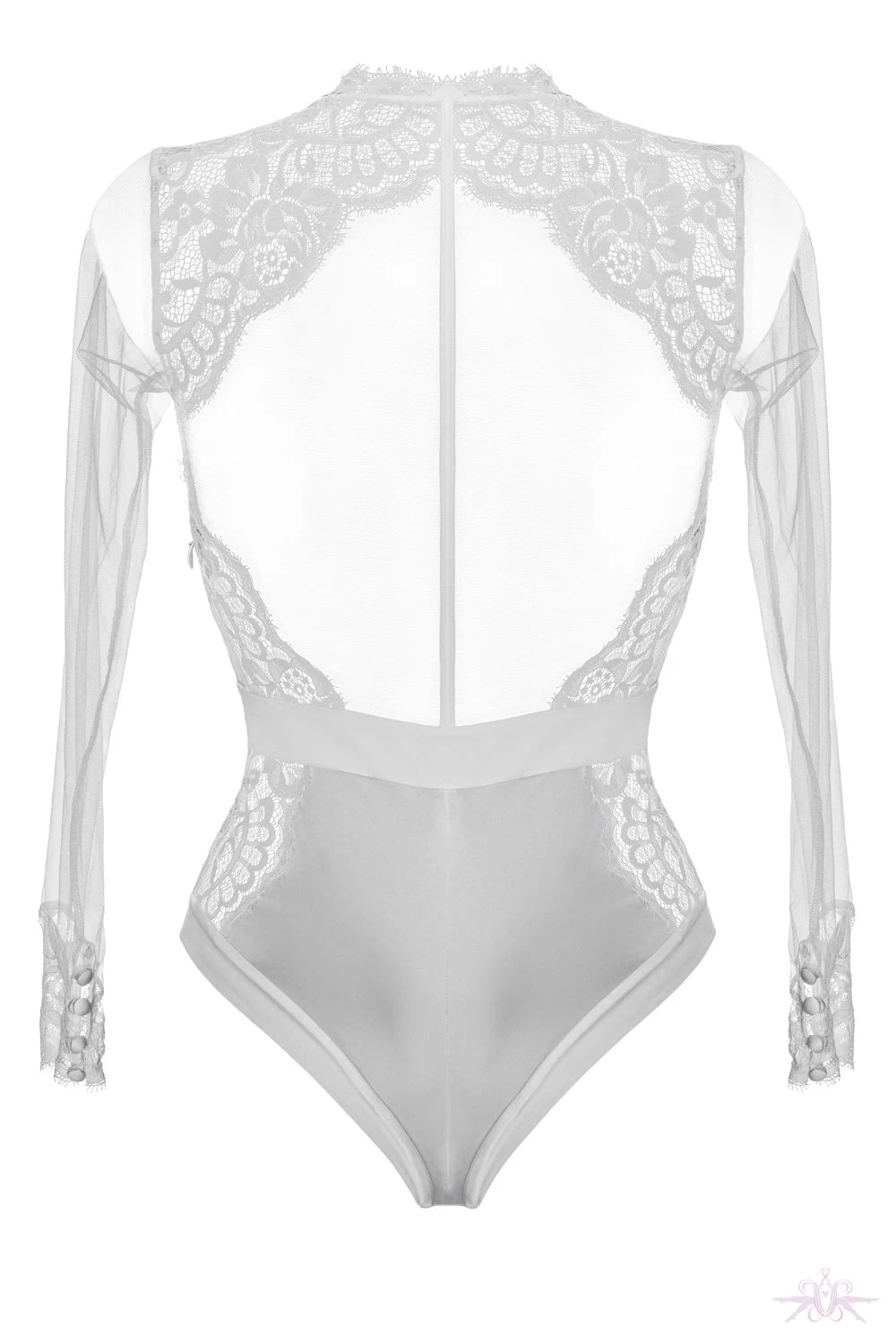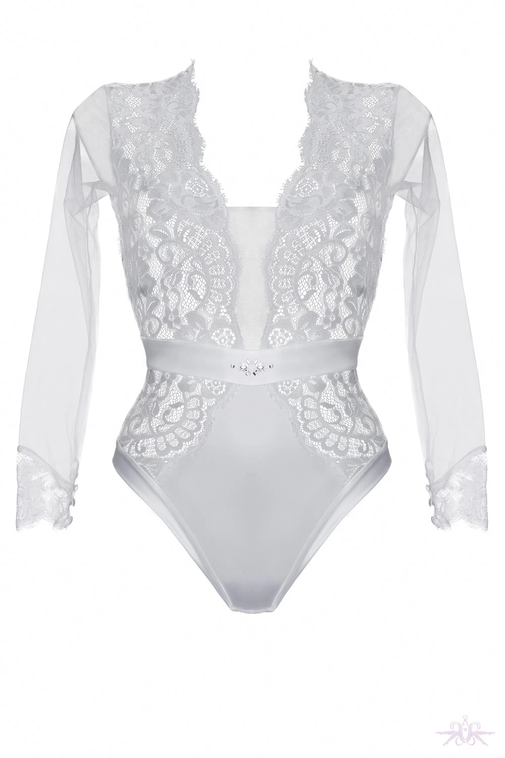 This luxurious white bodysuit from Prelude Milano is stunning with its satin and lace details. The bodysuit has decadent sheer long sleeves with a lace cuff and satin buttons and the lace panels to the front and rear are so glamorous and make this piece of lingerie really stand out. One of the highlights is the high neckline at the back with a sheer panel closed with a zip. The second are the Swarovski crystals on the satin waistband at the front which add glamour and decadence. A bodysuit which can be worn as a stand alone piece under a jacket or as lingerie.