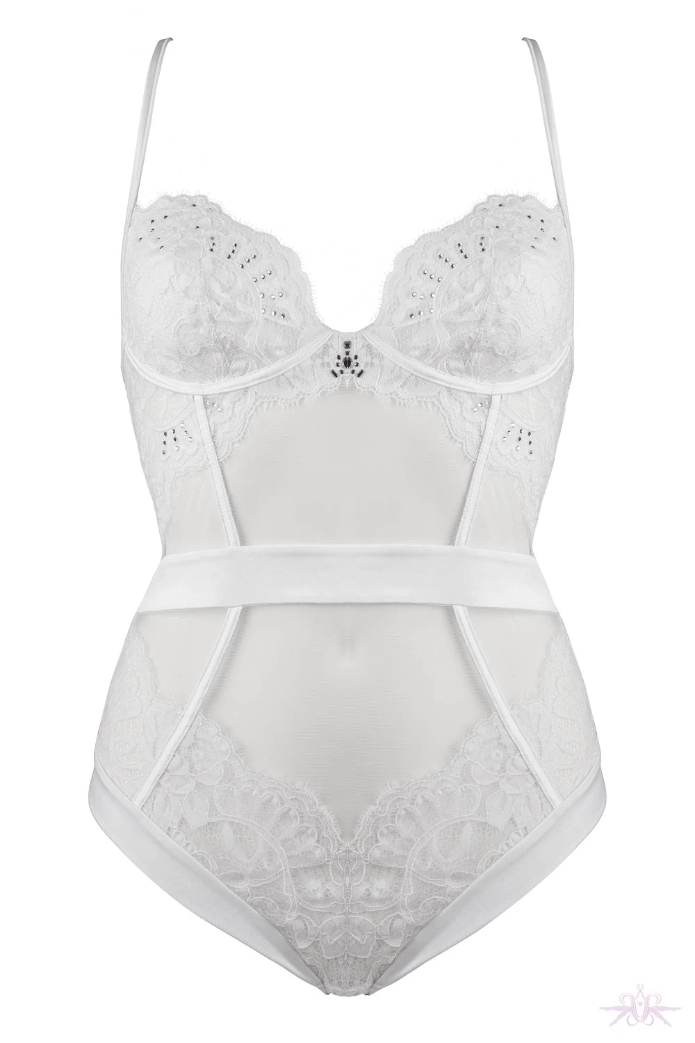 This luxurious white bodysuit from Prelude Milano is stunning with its satin and lace details. The bodysuit has decadent sheer panelling and the lace panels to the front and rear are so glamorous and make this piece of lingerie a real must have. The underwired bra supports and enhances the bust adoringly and the back fastens and adjusts in the usual way. Swarovski crystals on the satin waistband at the front which add glamour and decadence.
