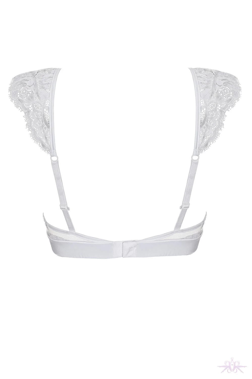 A luxurious white triangle bra with a gorgeous combination of sumptuous lace and satin. This bra has triangle cups that enhances the natural curve and shape of the bust. The wide satin band below the bust adds support and the adjustable shoulder straps and hook and eye fastenings enable the perfect fit. There are Swarovski crystals in between the cups which provide an element of glamour. Matching items are available and it is also available in black and grey.
