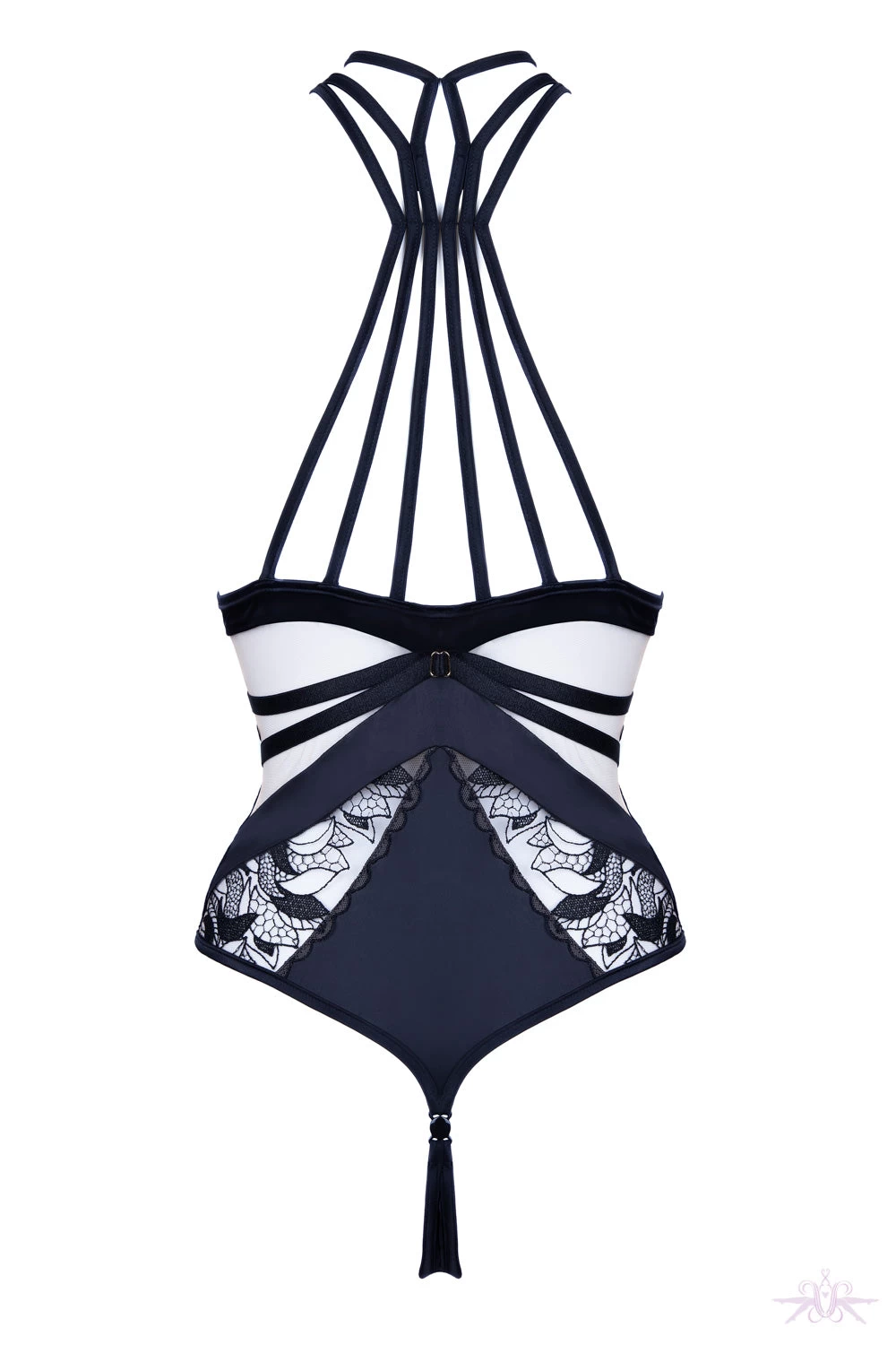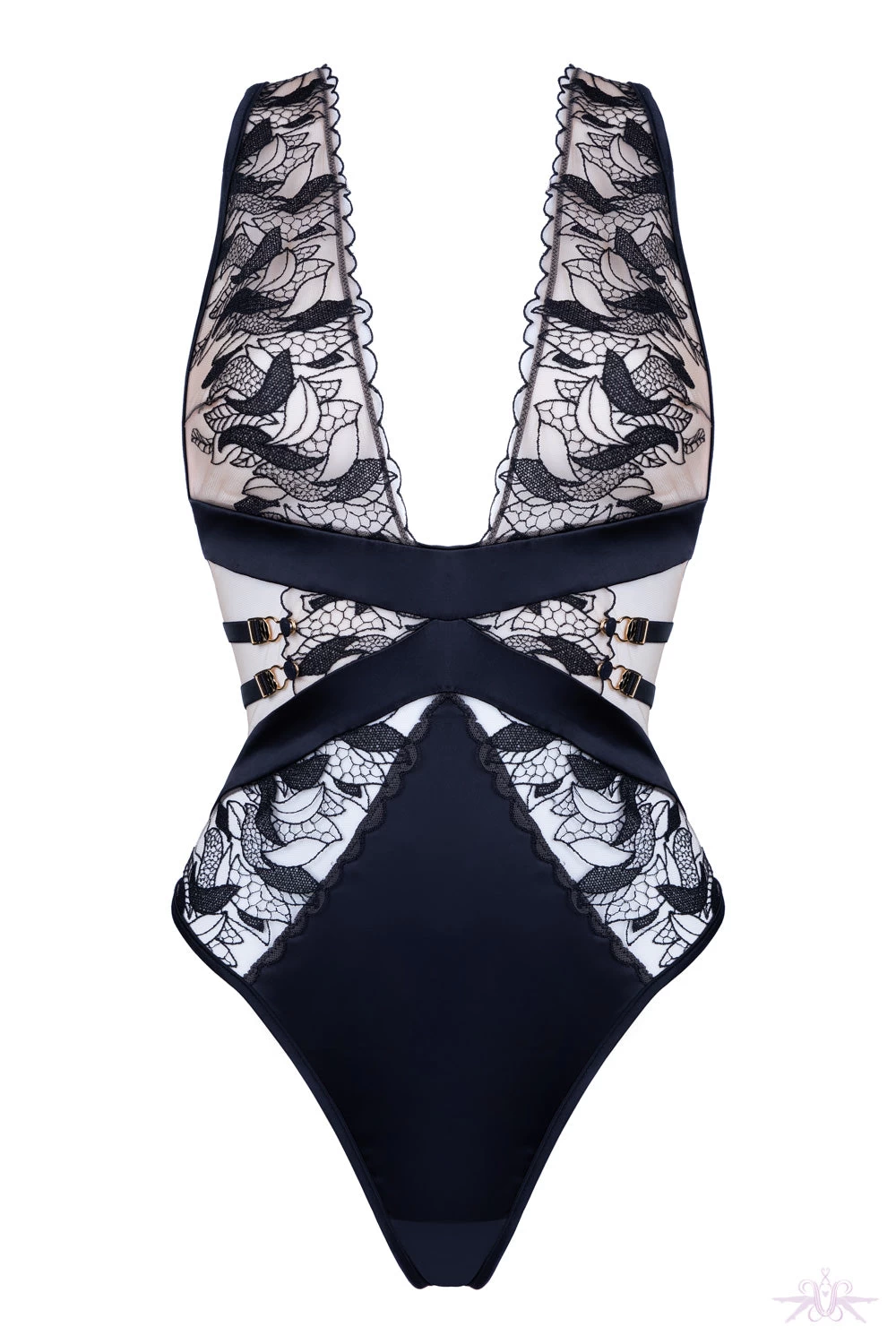 A luxurious bodysuit that is stunning with its satin and lace panels. The front has a low v-neck design with fluted edging adorned with floral lace and satin vertical panelling to enhance the waist. The signature straps to the front that fasten with a suspender clip add glamour. The rear has six straps that lead to the was it revealing the back. The gusset can be opened by way of a little black clip.