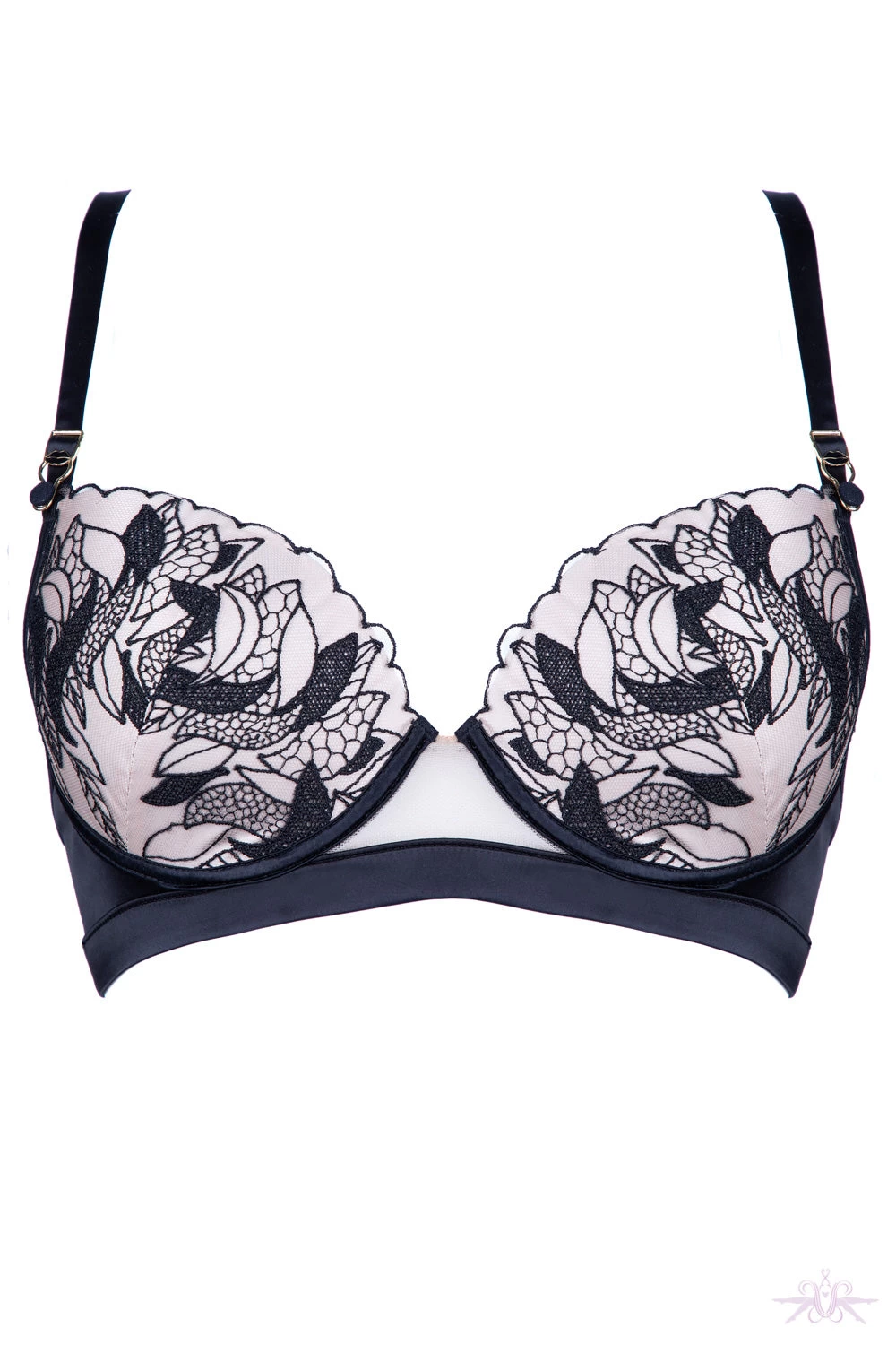 A gorgeous padded push up bra from the Prelude collection at Jolidon. This nude bra is overlaid with floral black lace and lined with black satin. Satin shoulder straps and waistband make this bra so glamorous. The signature suspender clip can be send at the front on the straps. Matching items are also available.